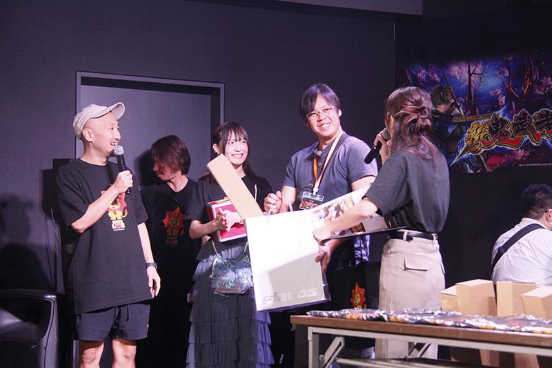 試打の順番待ちや試打を終えた人向けには、オリジナルグッズが当たる抽選会を実施。ピスタチオ田中さんと道井さんが進行し、BOXの中から当日配られた番号のくじを引いて抽選した。当選者にはポスターやクリアファイル、エンタライオンがプリントされたTシャツや前掛けがプレゼントされた。
