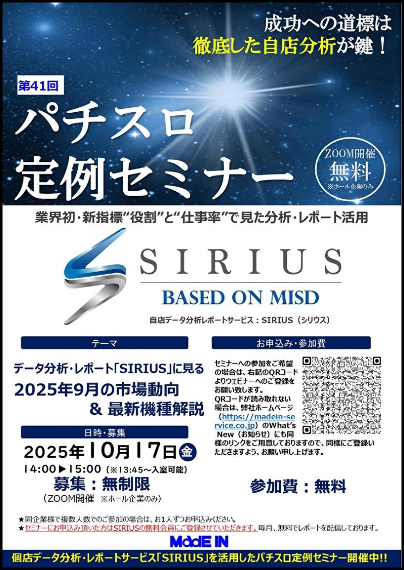 業界初の新指標を用いた自店舗実績データ分析・レポートサービス 「SIRIUS(シリウス)」を提供するメイドインサービス(東京都府中市)は10月17日(金)、第41回パチスロ定例セミナーをオンラインで開催する。